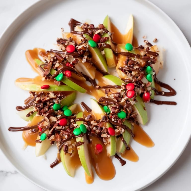 Save Pin A festive and visually stunning dessert featuring crisp apple slices drizzled with gooey caramel and chocolate, topped with holiday-inspired decorations. Perfect for Christmas gatherings!