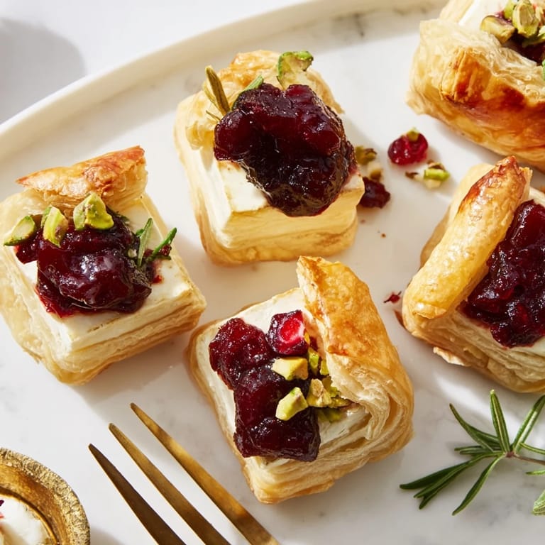 Save Pin A festive, savory tartlet arrangement featuring creamy brie, tangy cranberry sauce, and golden puff pastry, perfect for holiday gatherings.