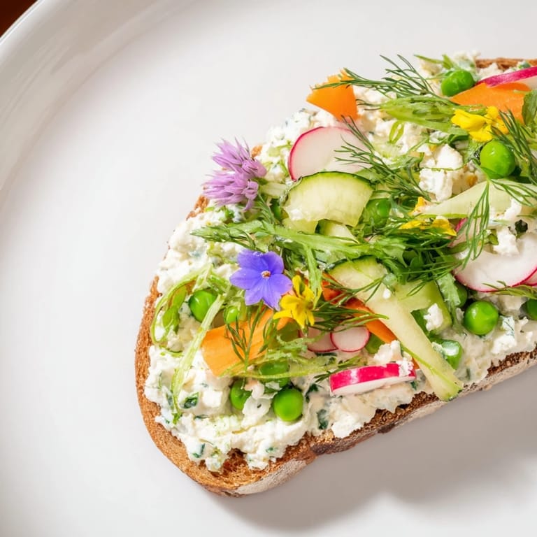 Save Pin A vibrant, open-faced sandwich featuring crisp garden vegetables, creamy herbed cheese, and rustic bread, evoking the freshness of a spring meadow. Perfect for light dinners or garden lunches.