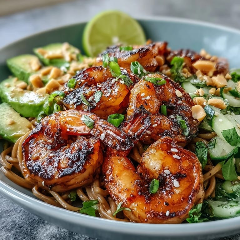 Save Pin One summer evening, my neighbor brought over a container of leftovers from her trip to Thailand—silky noodles tangled with charred shrimp that tasted like smoke and the sea. I couldn't stop eating it straight from the fridge, and when she mentioned it took her barely thirty minutes to make, I knew I had to recreate it. This bowl became my go-to when I wanted something that felt restaurant-quality but didn't demand hours in the kitchen. The magic is in the simplicity: grilled shrimp with a touch of char, cool noodles dressed in sesame, and toppings that crunch and give way in all the right ways.