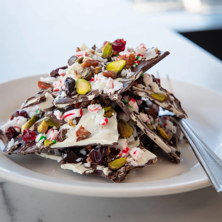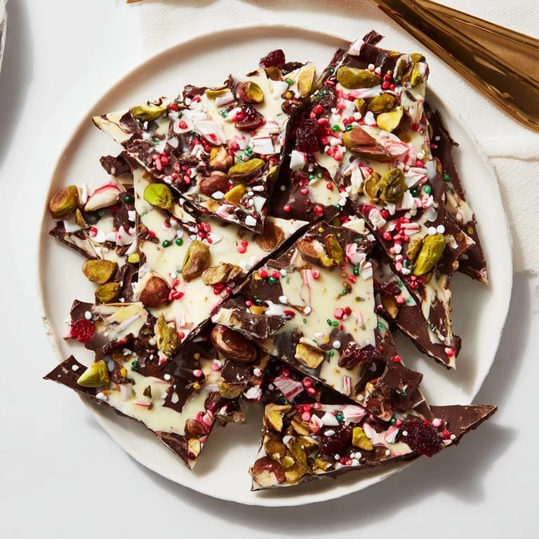 Save Pin A festive and eye-catching chocolate bark, loaded with colorful toppings and broken into elegant shards—perfect for gifting or as a centerpiece for your holiday dessert table.
