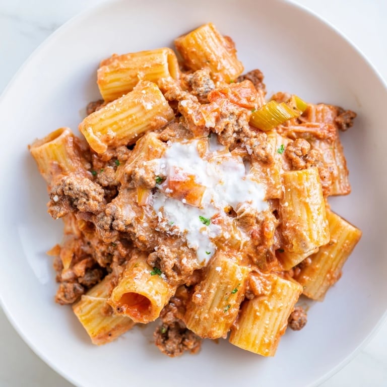 - While the ragu simmers, boil salted water in another pot and cook rigatoni or penne to al dente. Before draining, scoop out about 100 ml of starchy pasta water—this is liquid gold for loosening the sauce later.