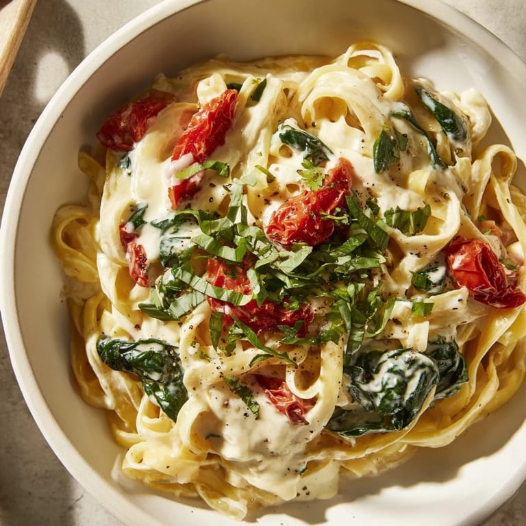 Save Pin A luscious, comforting pasta dish simmered in a single pot, featuring tender noodles, sun-dried tomatoes, spinach, and a medley of fresh herbs in a velvety garlic cream sauce.