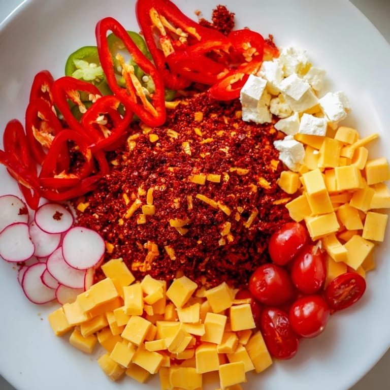 - In a small bowl or directly on the platter, arrange your chili flakes and sliced peppers as a vibrant mound. Make it look intentional and beautiful, almost like you're creating edible art. This is the visual hook that catches everyone's eye first.